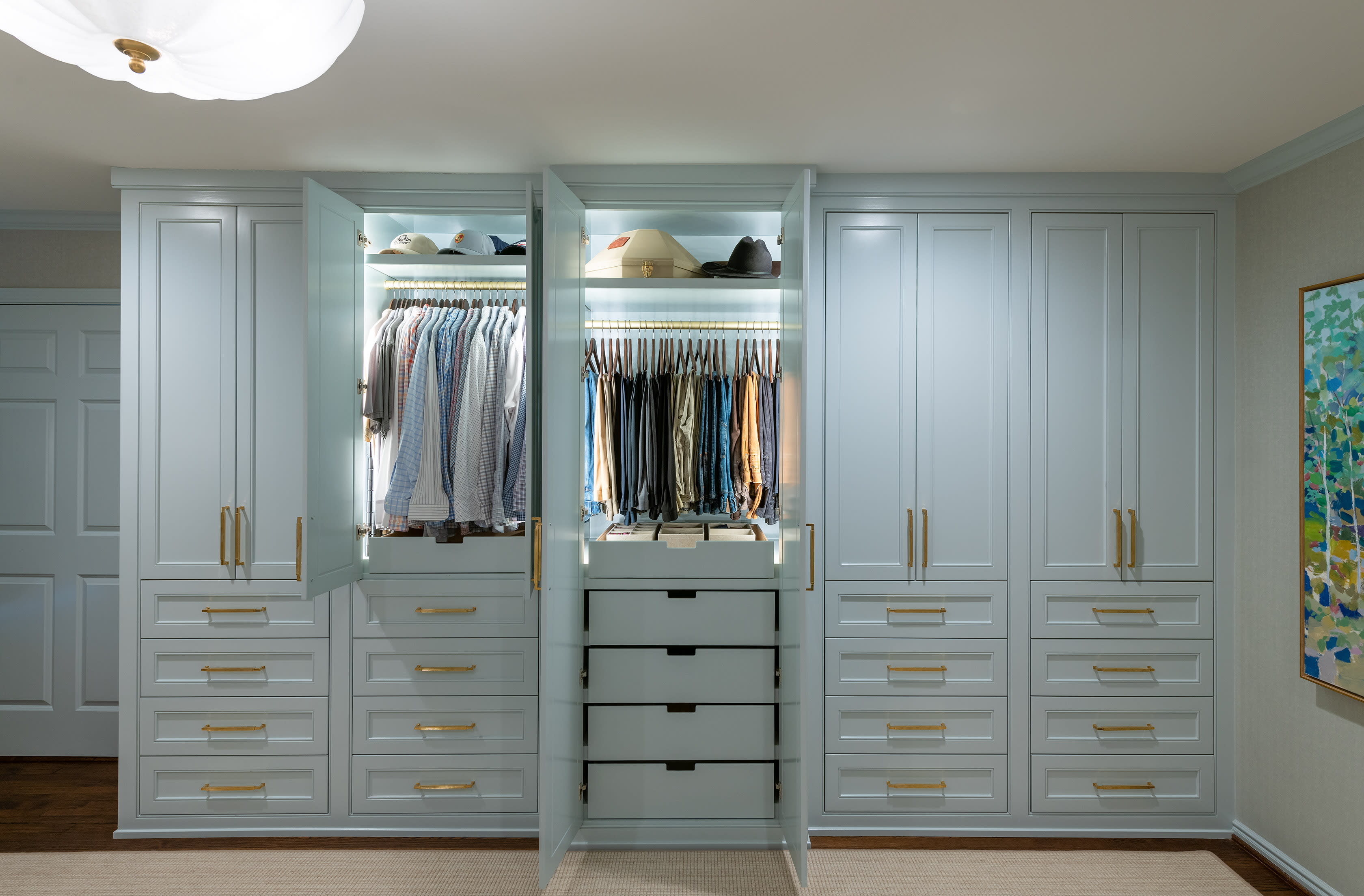 View GalleryWhen there's not enough walk-in closet space in your master, consider a wall unit in your bedroom. Each box has drawer storage and hanging for your wardrobe. Painted a beautiful soft blue with integrated LED lighting, and accented with brass hardware, it's the perfect solution when you're short on closet storage!