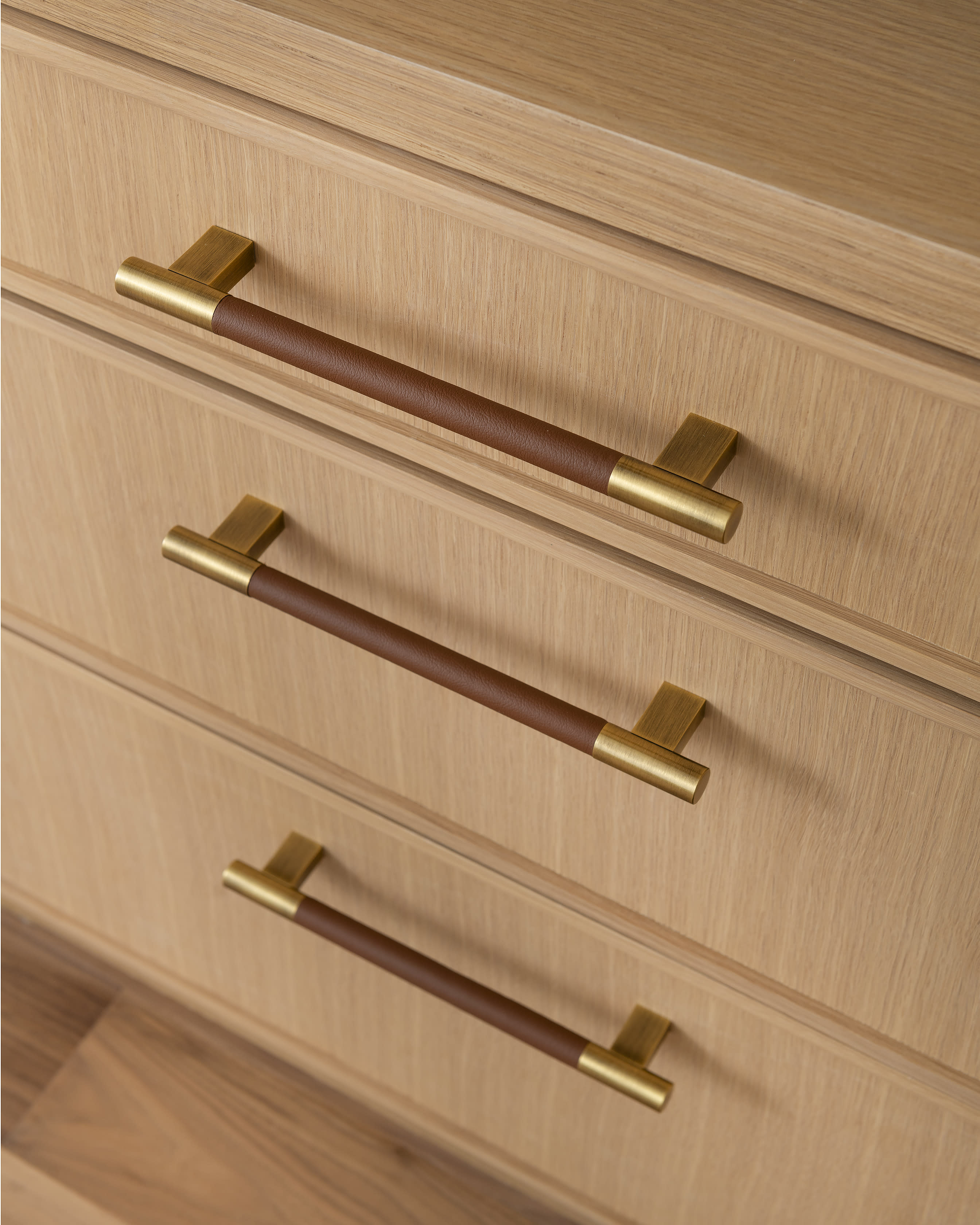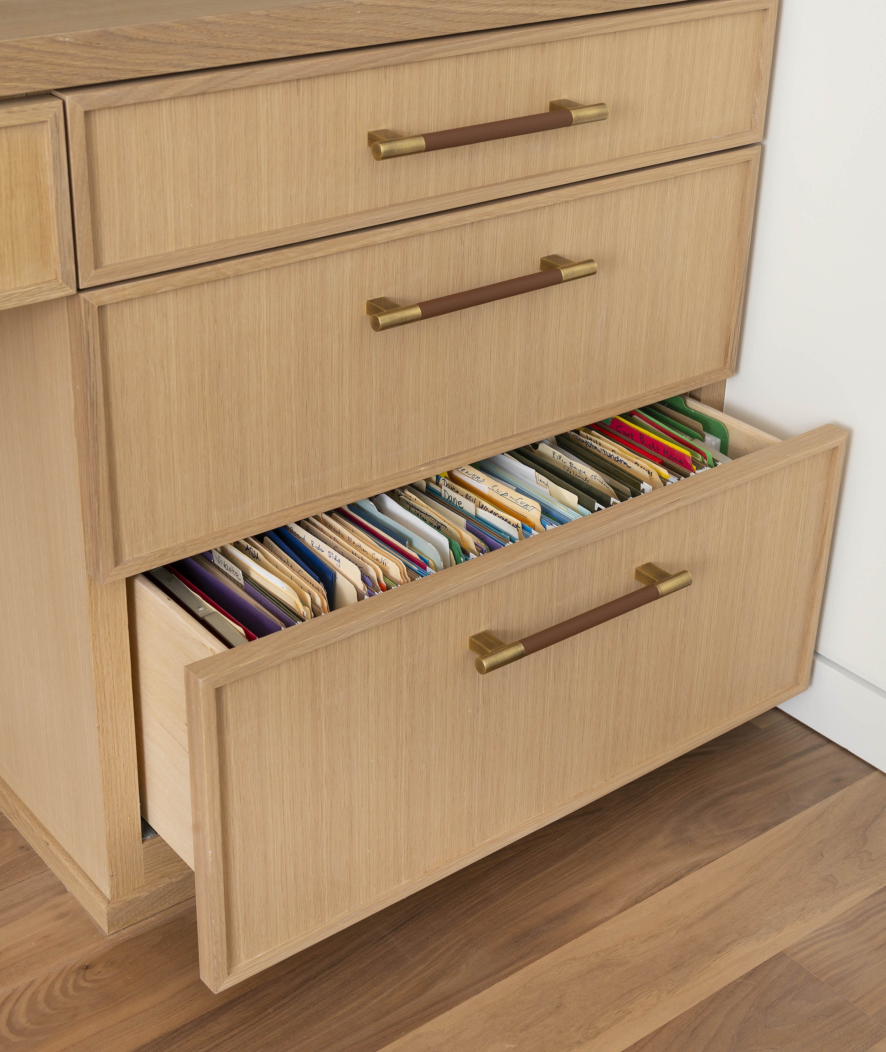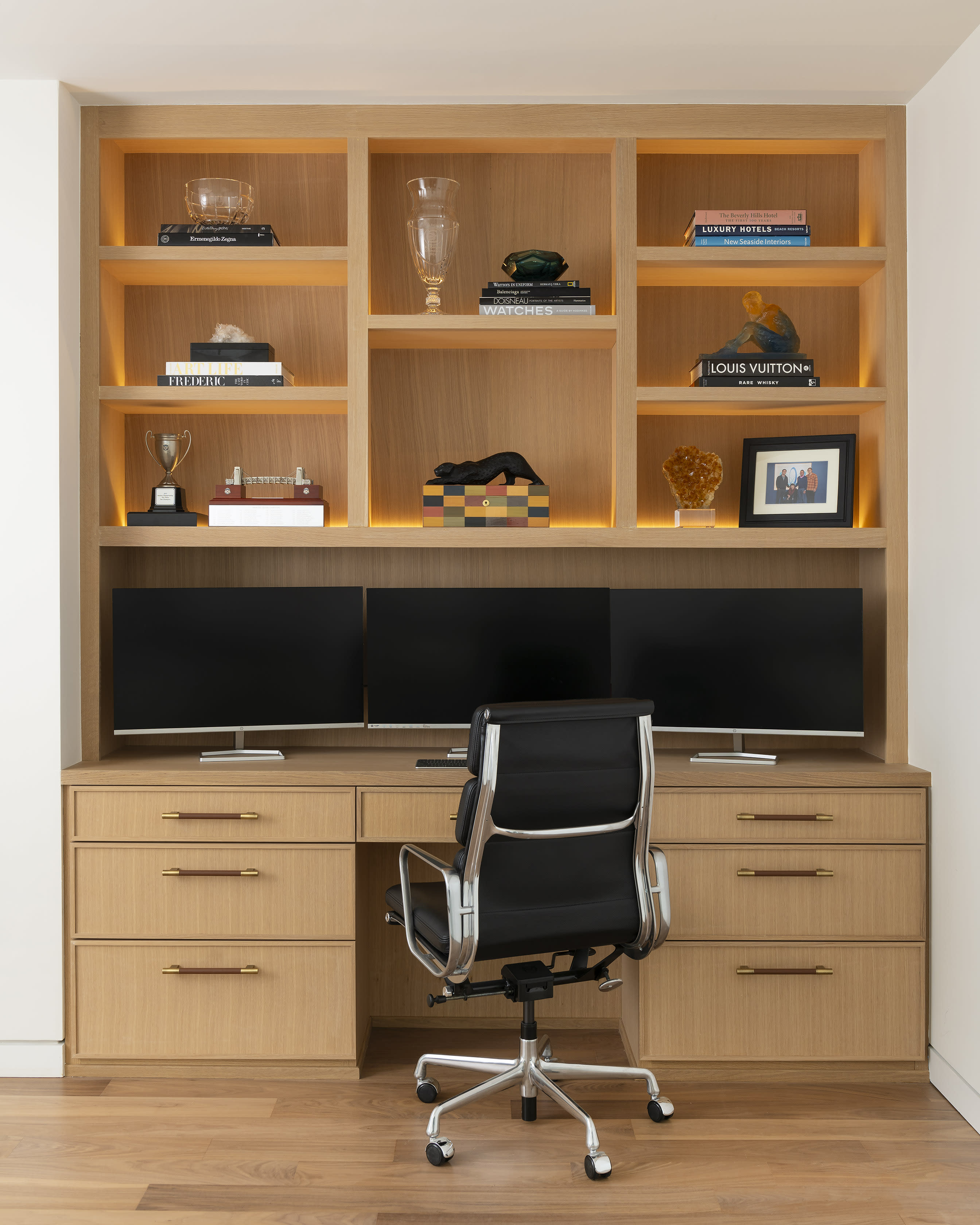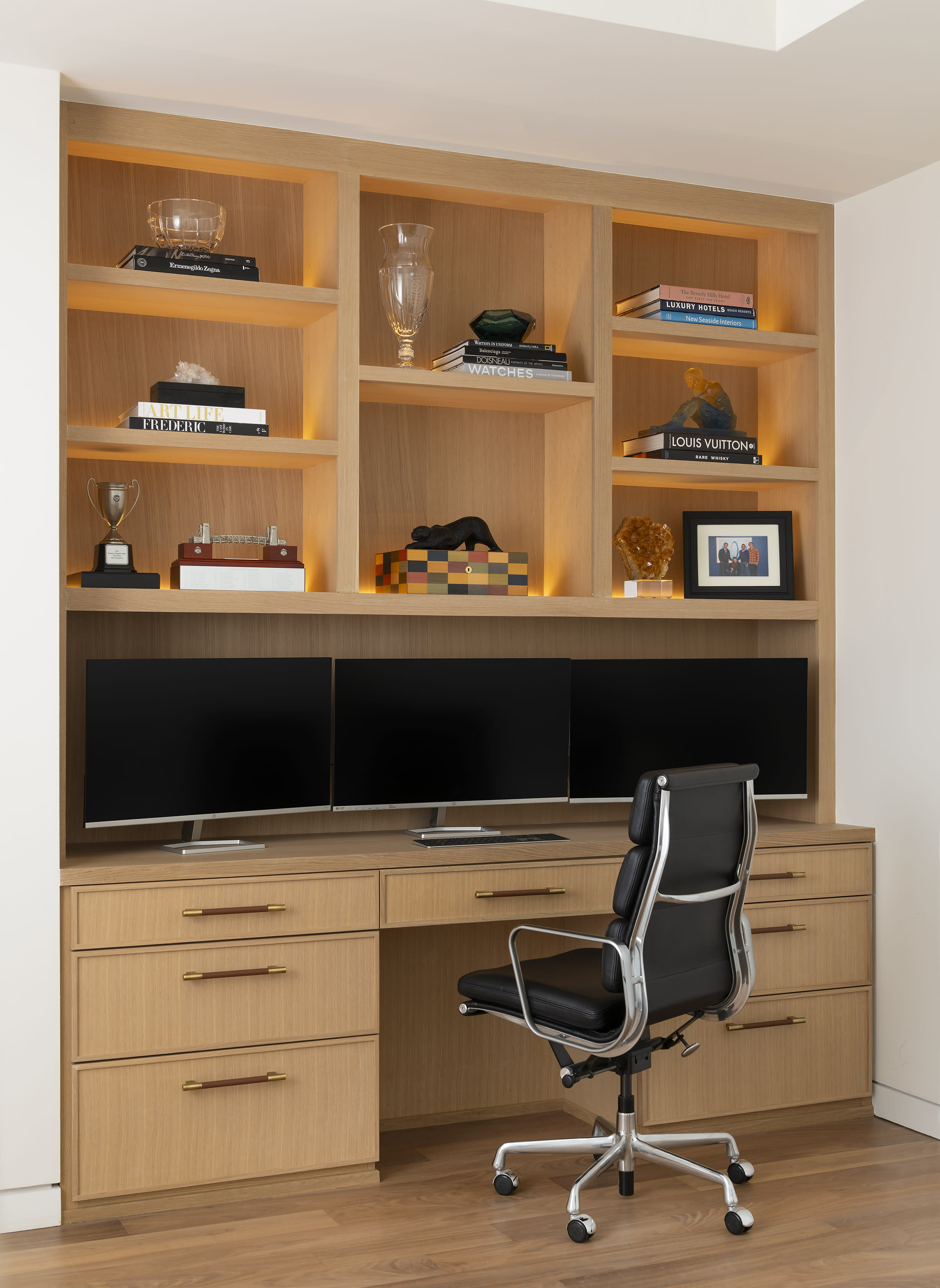 View GalleryOur client's study had the perfect alcove to do a deep built-in desk made of beautiful rift cut white oak. Cabinetry is a slim shaker style accented with rich leather and brass hardware. The display shelves are back lit with LED lighting.