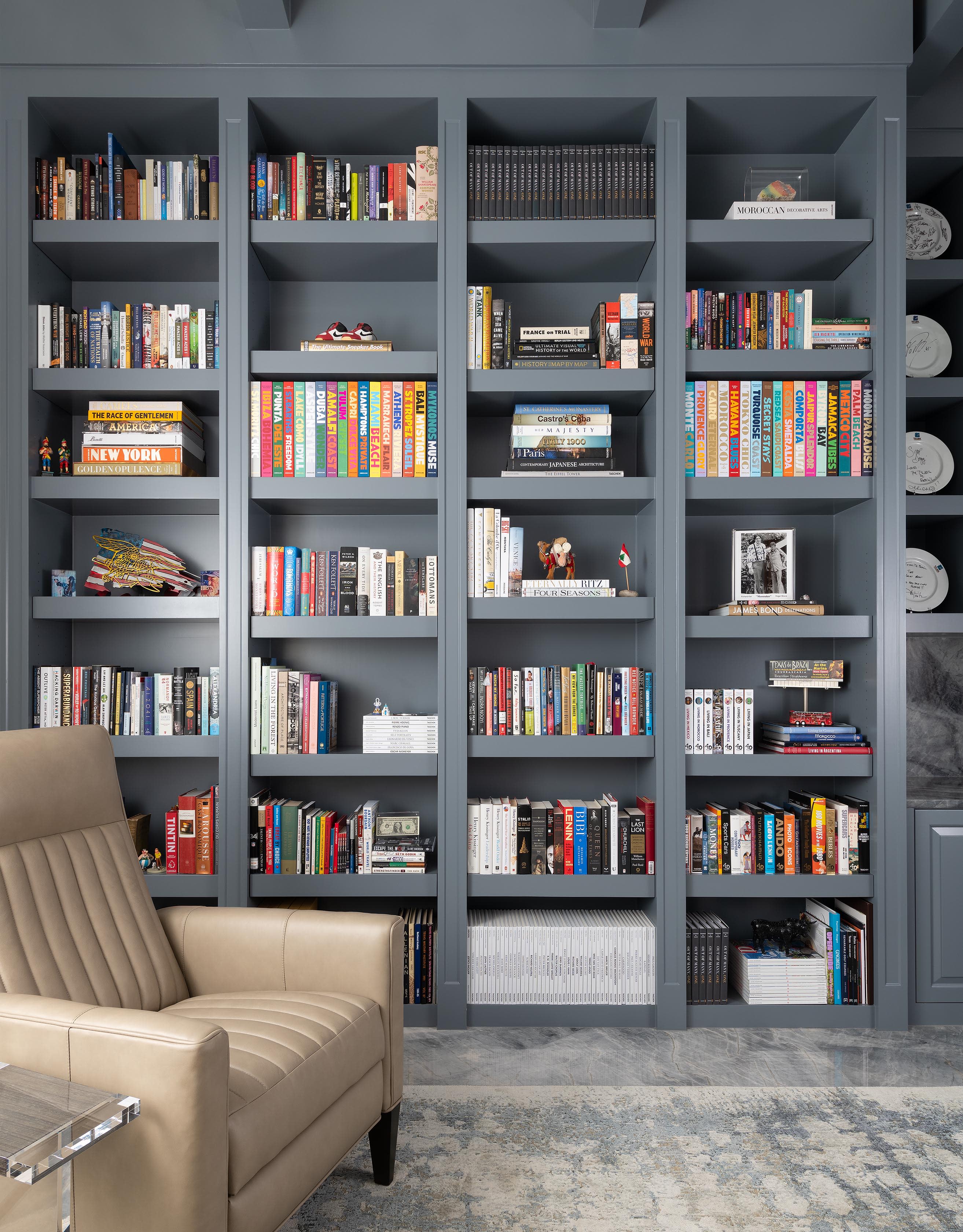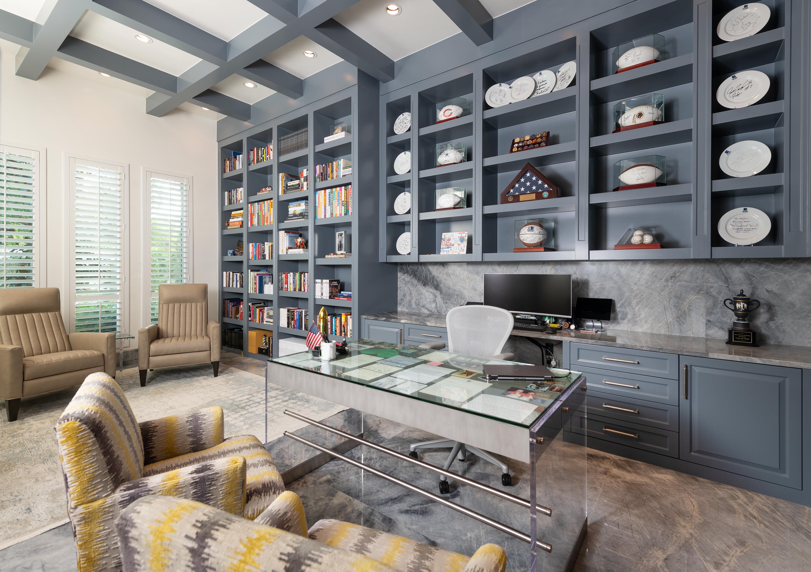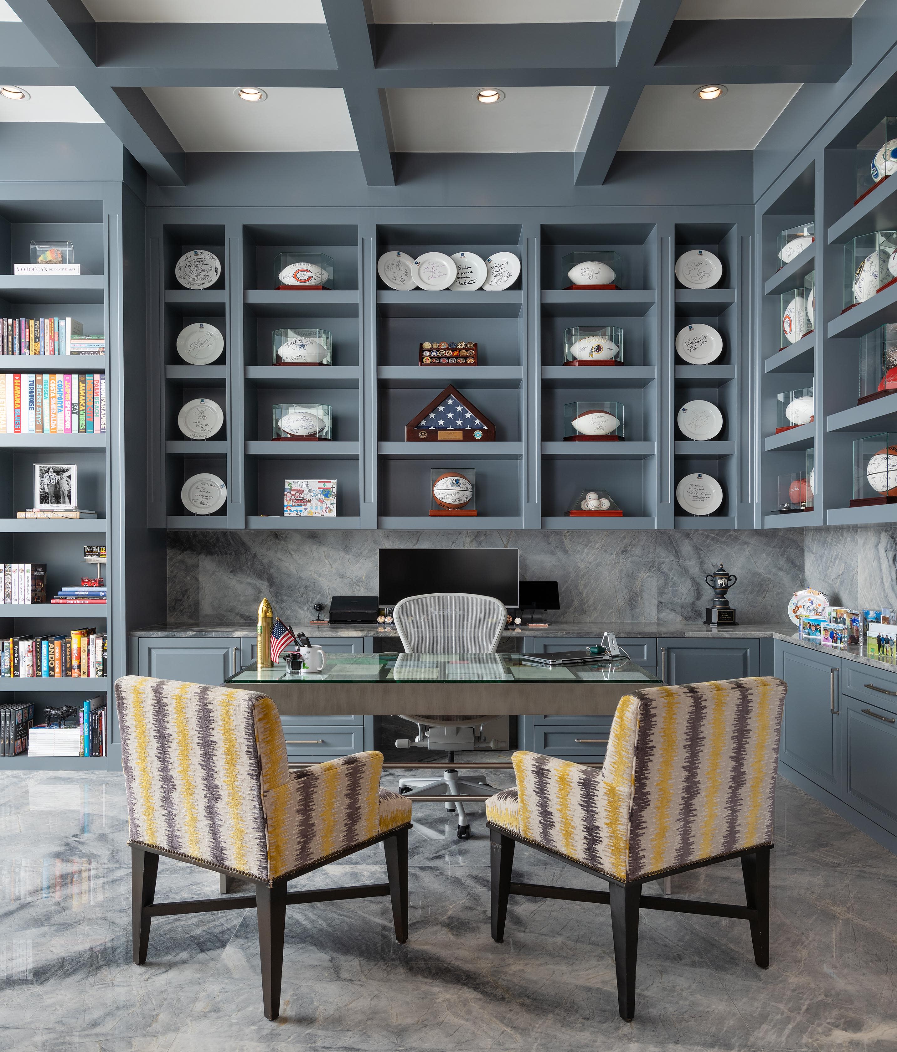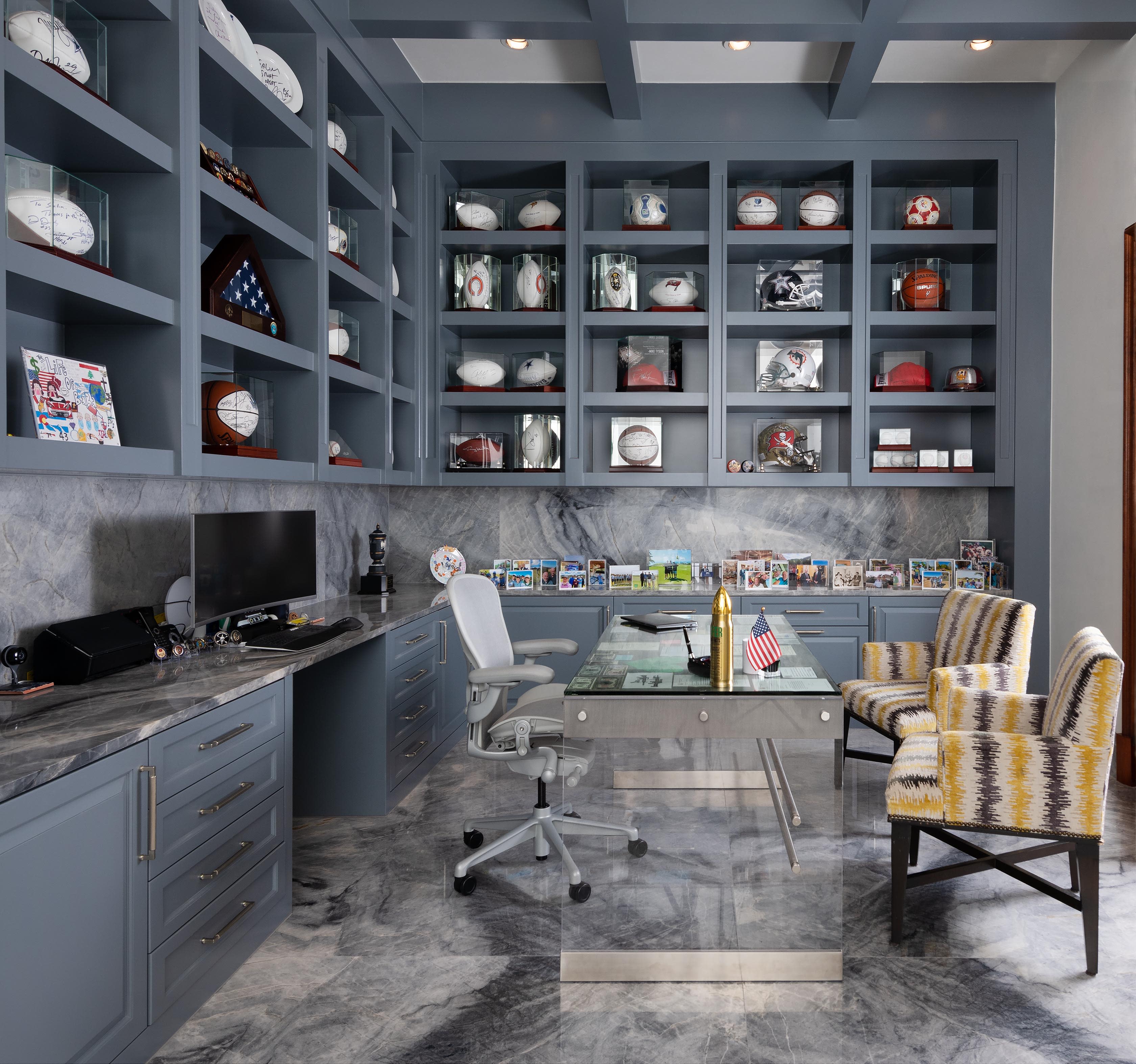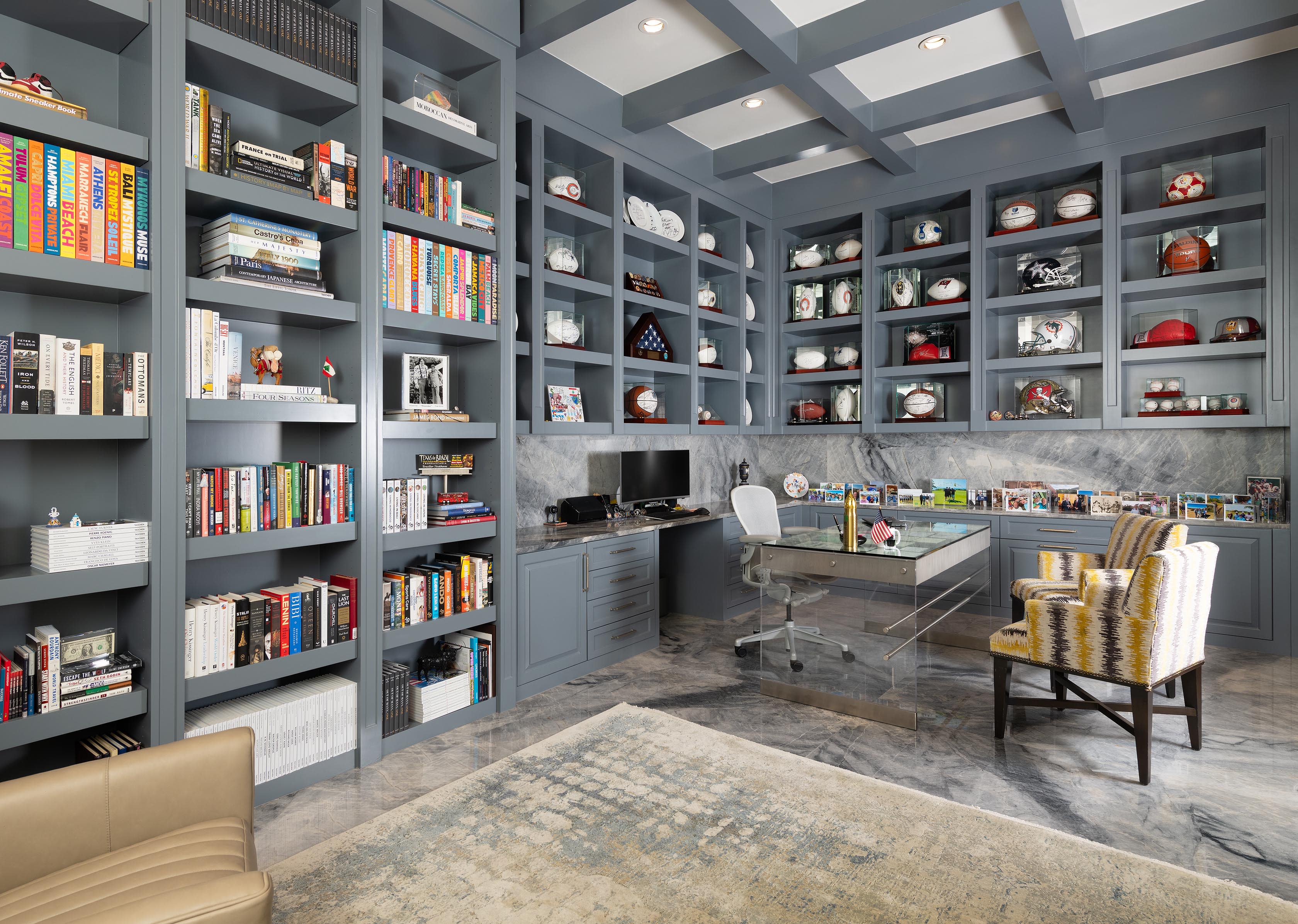 View GalleryThis office was the perfect size to incorporate both a home office work space and a library sitting area. On the office side, we designed lots of display cases for our client's memorabilia and full desk units below that wrapped all around the room. It features pull-outs for multiple printers, file cabinets and pull-out shelving for storage. For the library side, we built floor to ceiling custom cabinetry to house their book collection. Painted a beautiful grey, stunning marble countertops, backsplash and flooring make the space a showstopper!
