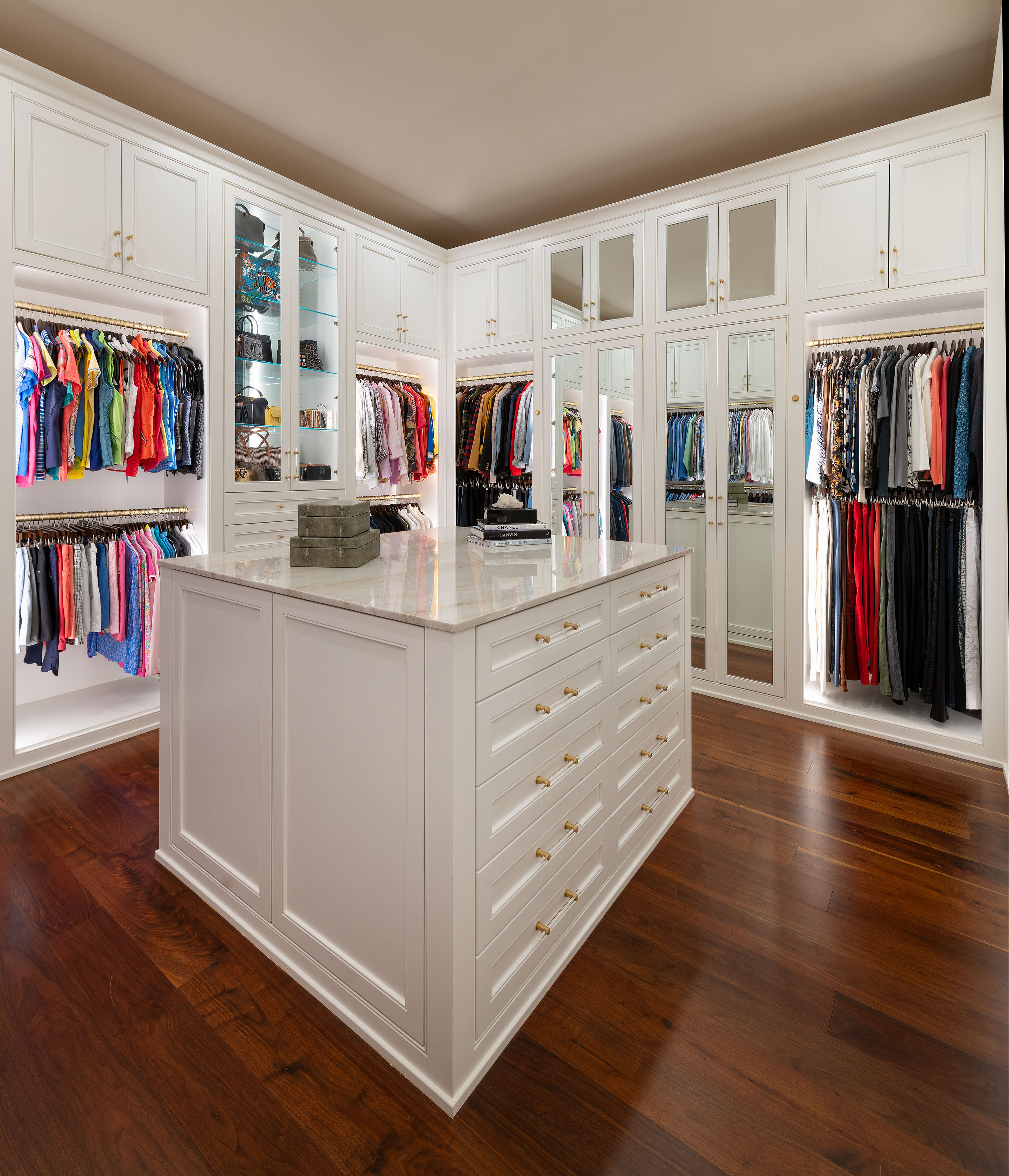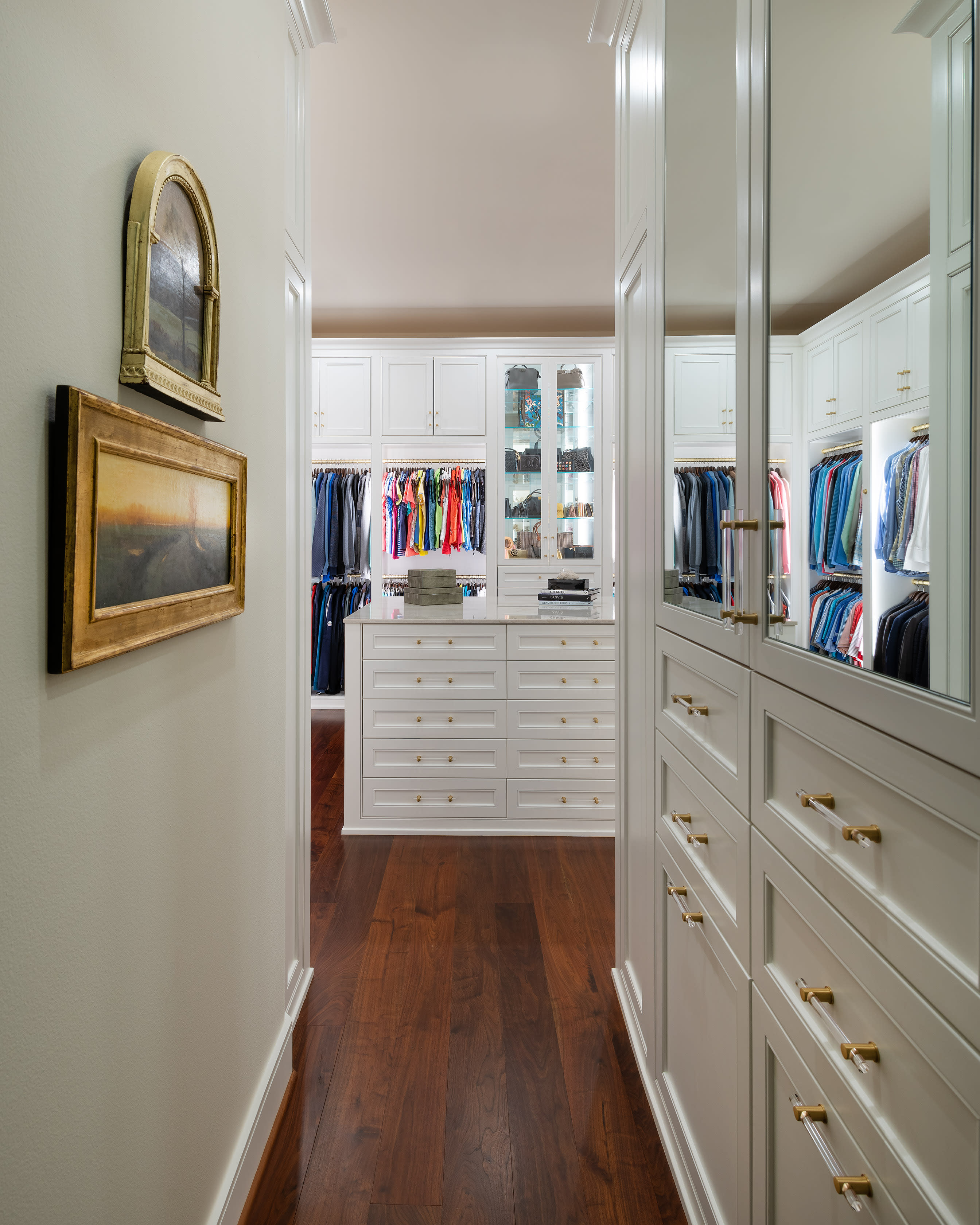 View GalleryThis beautiful walk-in features custom built beaded shaker style inset cabinetry with LED lighting throughout. A large double sided island for her side and his anchors the space. Boxes are built 24" deep for their wardrobe with enclosed upper cabinets to 10' high. Pull-out tie rack, built-in drawer inserts, brass hardware, and tall mirrored door's, finish out this large His & Her's Luxury Closet.